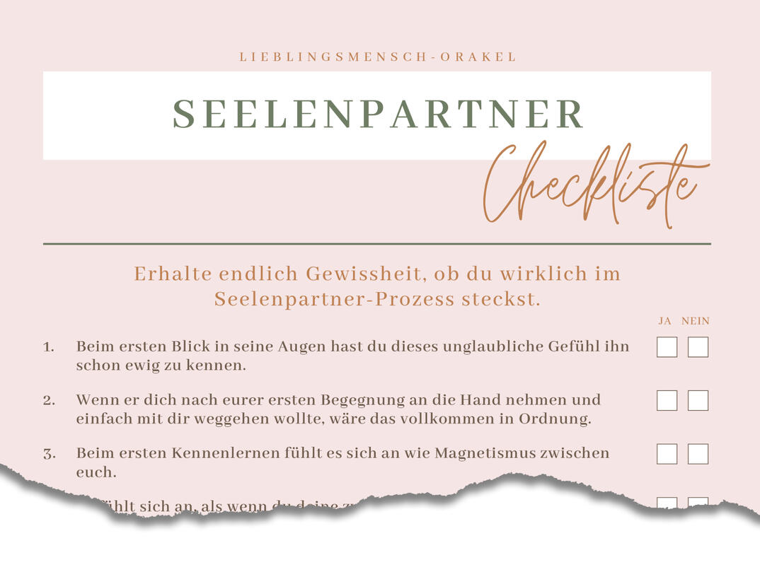 Die Erkenntnis, ob du wirklich in einem Seelenpartner-Prozess steckst oder dir vielleicht doch eher etwas einredest, ist besonders wichtig! Ich habe daher diesen Test für dich entwickelt, um dir schnell erste Klarheit zu geben.Genau diese Klarheit hat mir damals lange gefehlt, als ich vor einigen Jahren meinen Seelenpartner traf. Heute wünsche mir, ich hätte es damals direkt verstehen können, denn es hätte mir viel Kummer und Sorgen erspart.Nimm dir nun ca. 10 Minuten Zeit, um mit mir gemeinsam durch den Test zu gehen. Lade dir dazu vorher die Seelenpartner-Checkliste herunter, die du unten auf dieser Seite findest.Du kannst sie dir entweder ausdrucken oder einfach auf dem Computer als PDF öffnen und die Fragen mit JA oder NEIN ankreuzen.Wenn du 10 bis 12 dieser 15 Statements mit JA beantwortest, kannst du dir sicher sein: Du steckst mitten im Seelenpartner-Prozess!